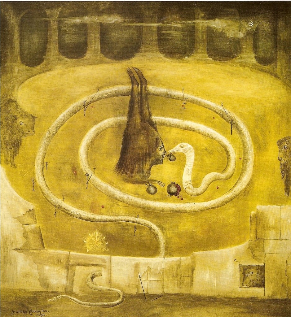 [Leonora Carrington’s art is exquisite and so inspiring for my theme this month! I chose “Le Fruit Défendu” or “Forbidden Fruit” to inform my piece. Image can be seen below.]